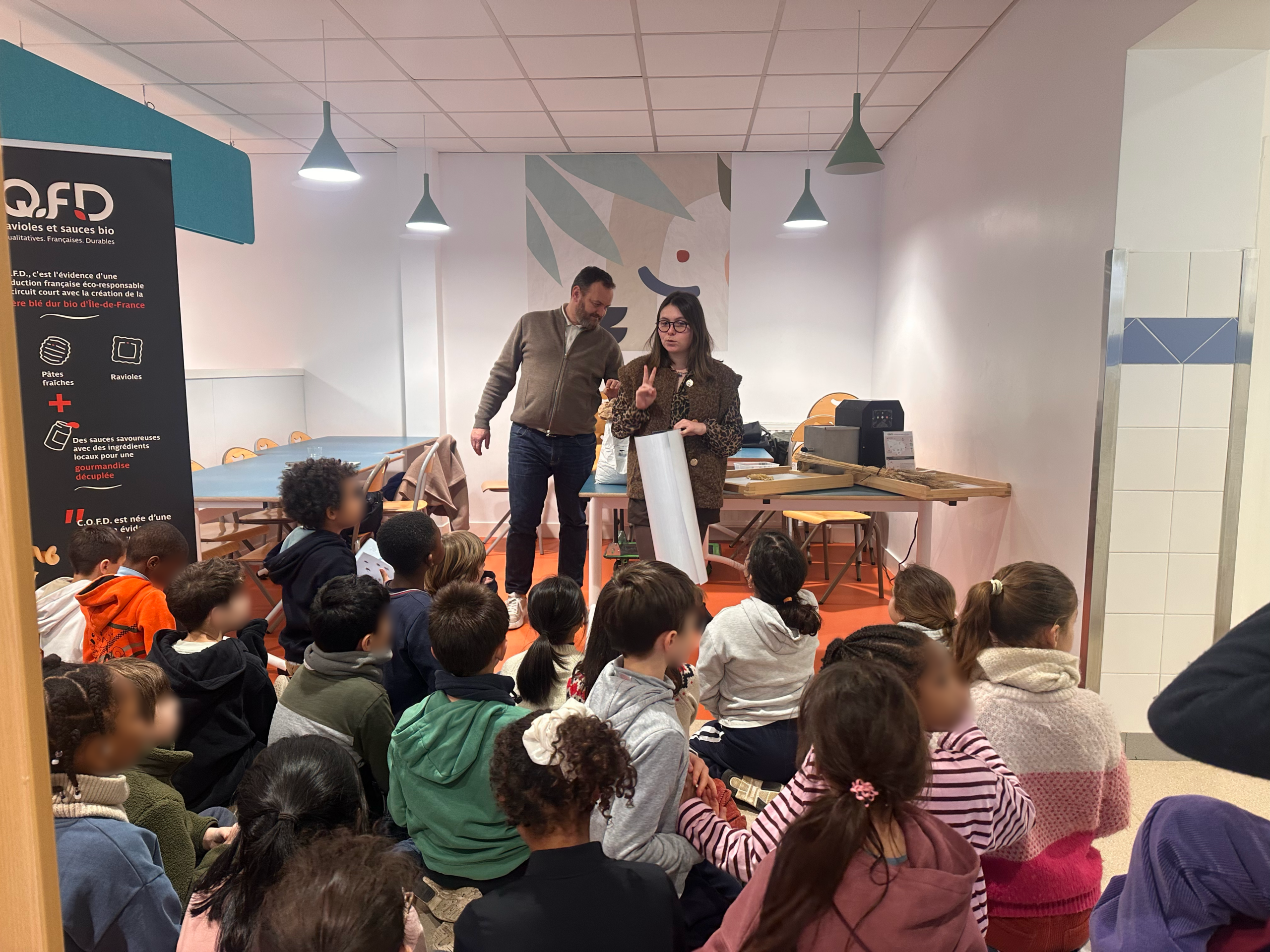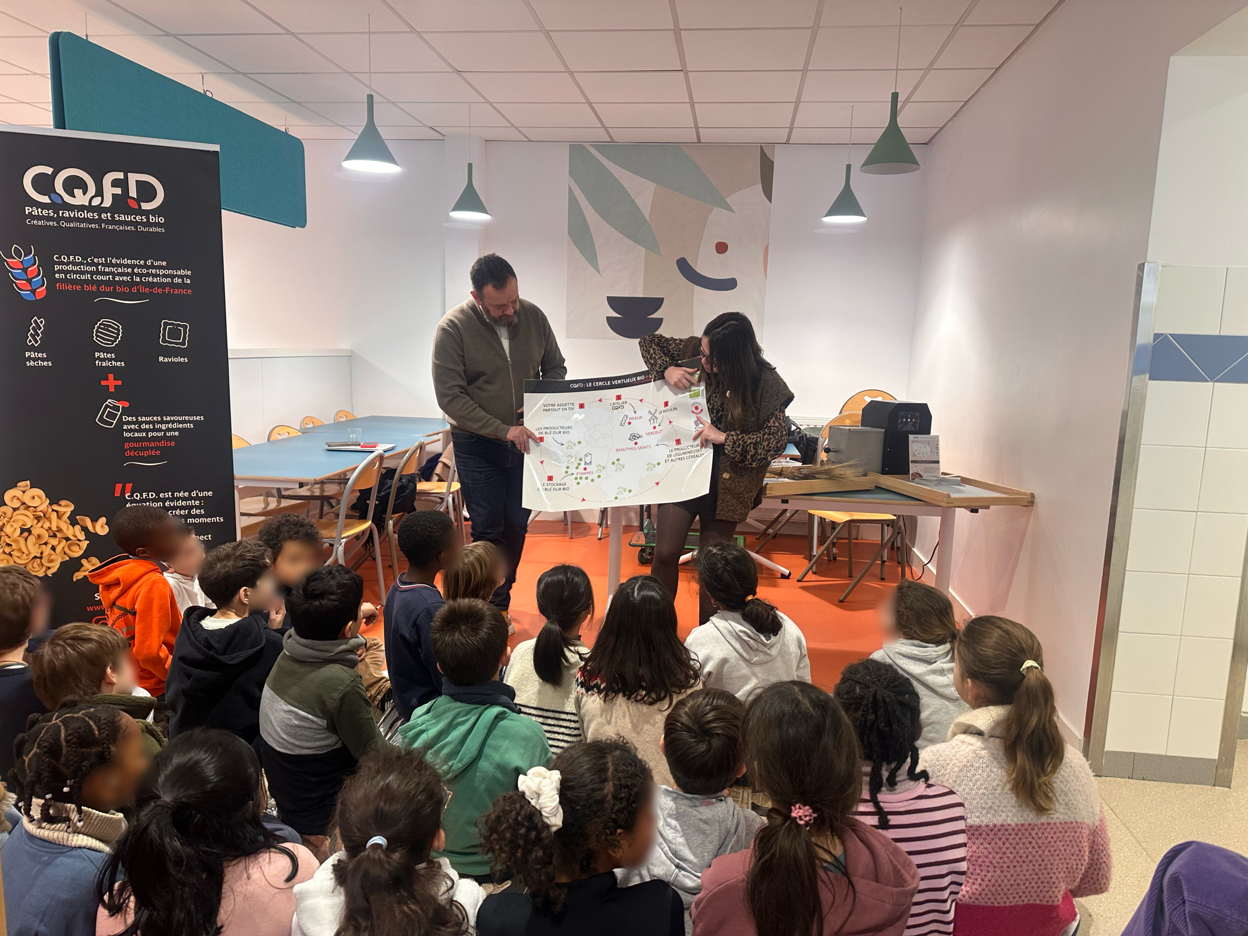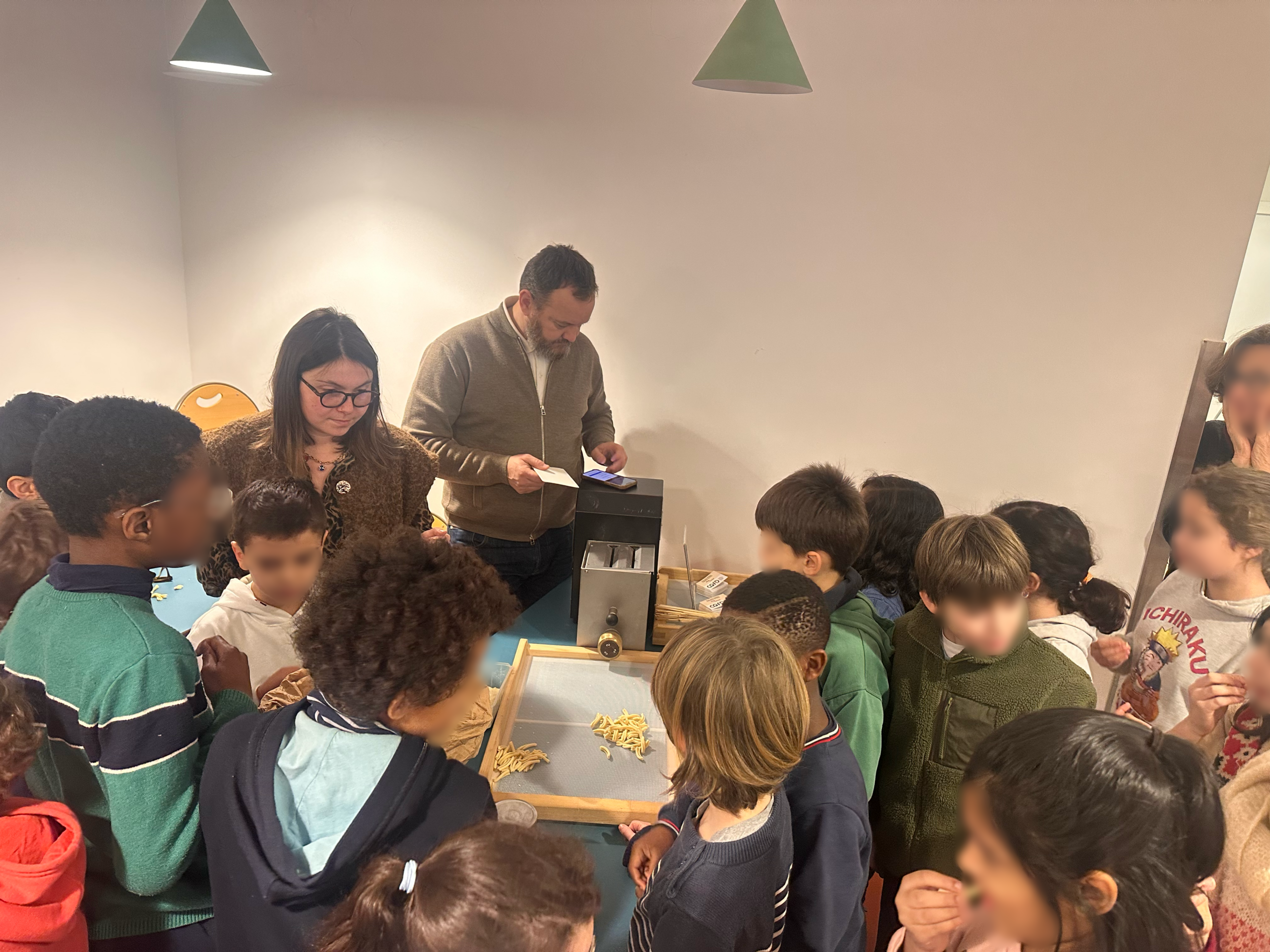 Les enfants ont découvert, étape par étape, le processus de fabrication des pâtes et l’importance des circuits courts. CQFD, entreprise engagée, produit des pâtes bio à partir de blé issu de producteurs locaux.