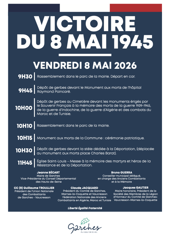 La Ville de Garches invite les Garchois à se rassembler le vendredi 8 mai à l’occasion de la commémoration de la Victoire de 1945.
