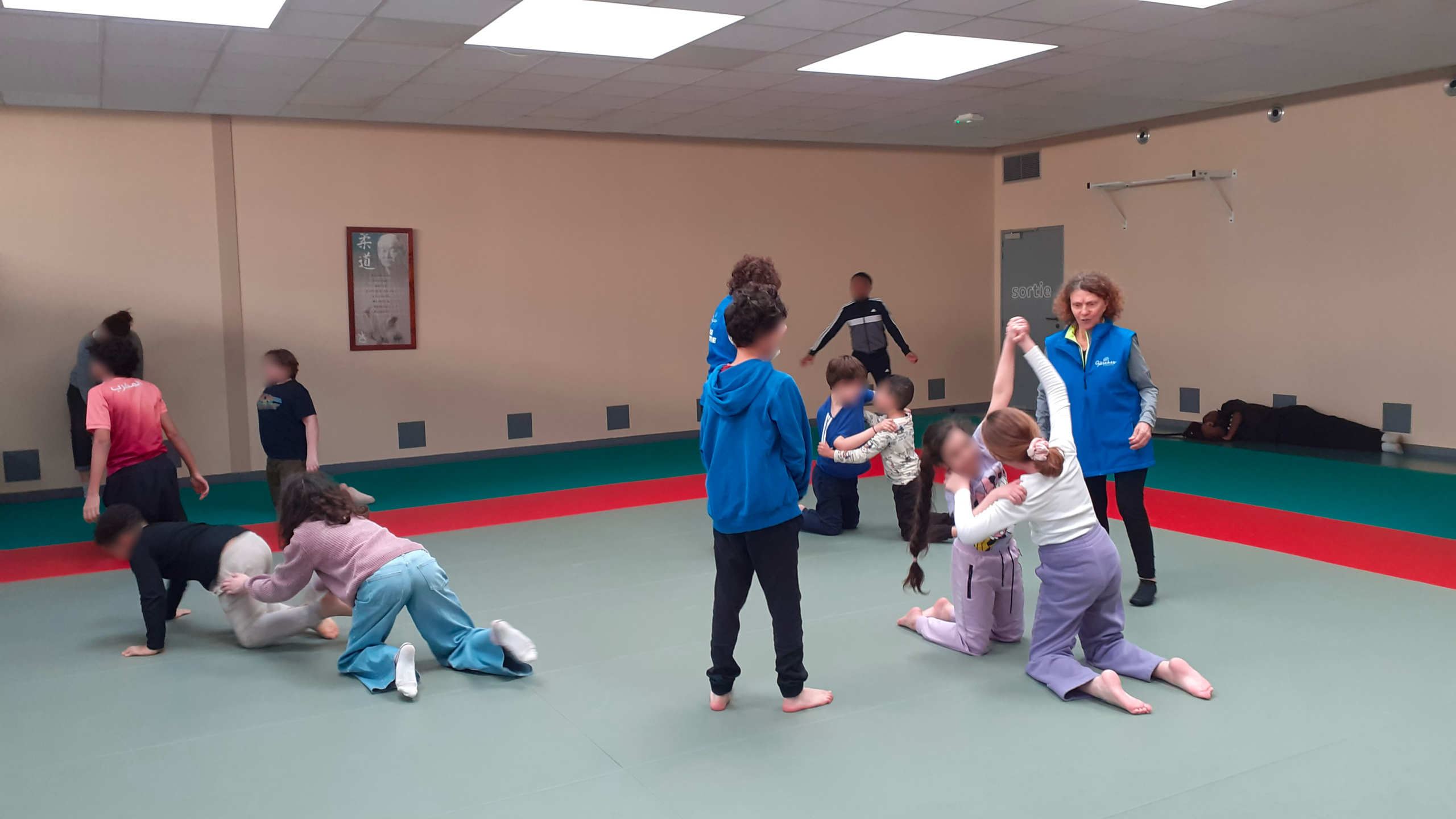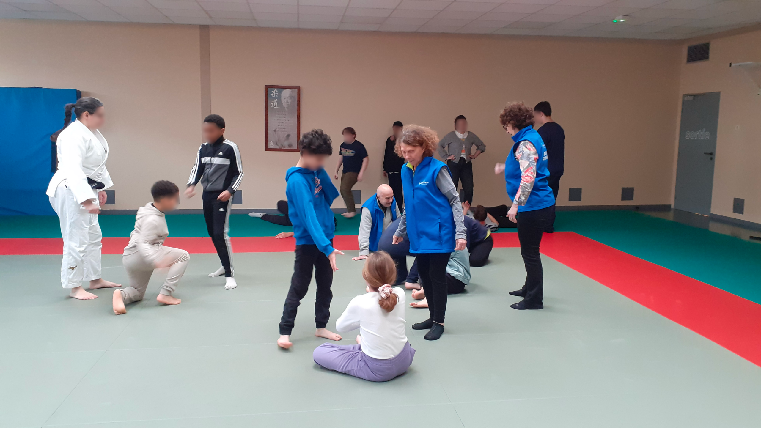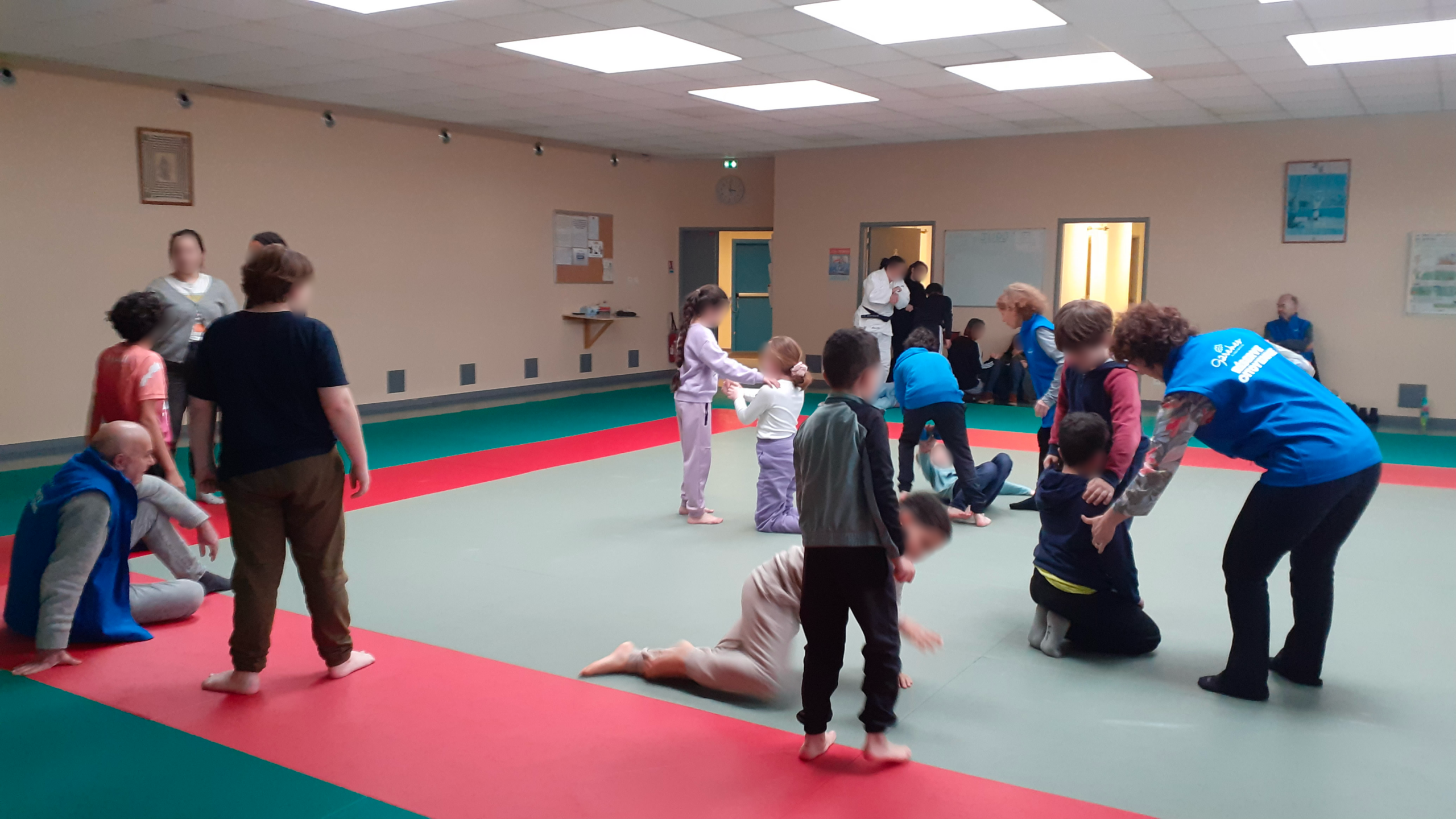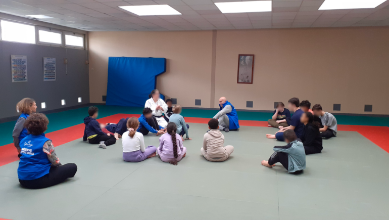 Au programme de ce cours : salut en début et fin de séance, apprentissage de mots en japonais sur le judo, exercices ludiques en duo sous l’œil attentif et bienveillant de tous les intervenants puis distribution d’une collation.