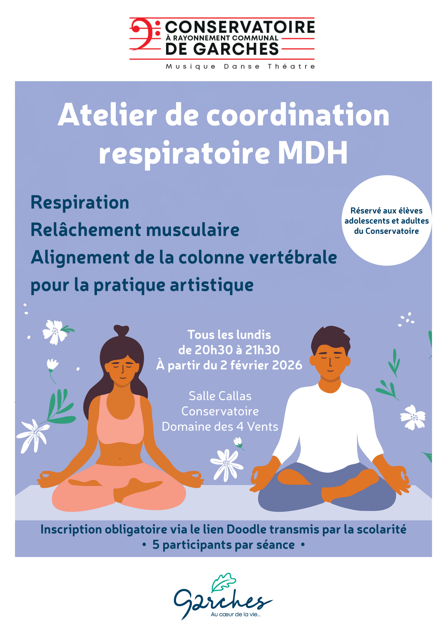Le Conservatoire de Garches proposera, à partir du lundi 2 février, une nouveauté : un atelier expérimental de coordination respiratoire MDH, destiné aux élèves déjà inscrits adolescents et adultes. Cet atelier complémentaire, sans évaluation, sera mis en place à titre expérimental.
