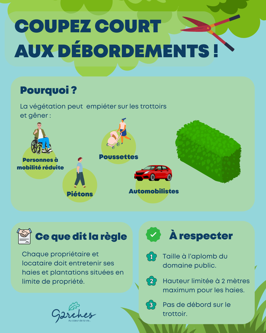 La Ville de Garches rappelle que chaque propriétaire et locataire est tenu d’entretenir ses haies et plantations situées en limite de propriété afin qu’elles ne débordent pas sur la voie publique. Les haies doivent être taillées à l’aplomb du domaine public et à leur hauteur, limitée à 2 mètres maximum et moins dans les espaces où le dégagement de la visibilité est indispensable.