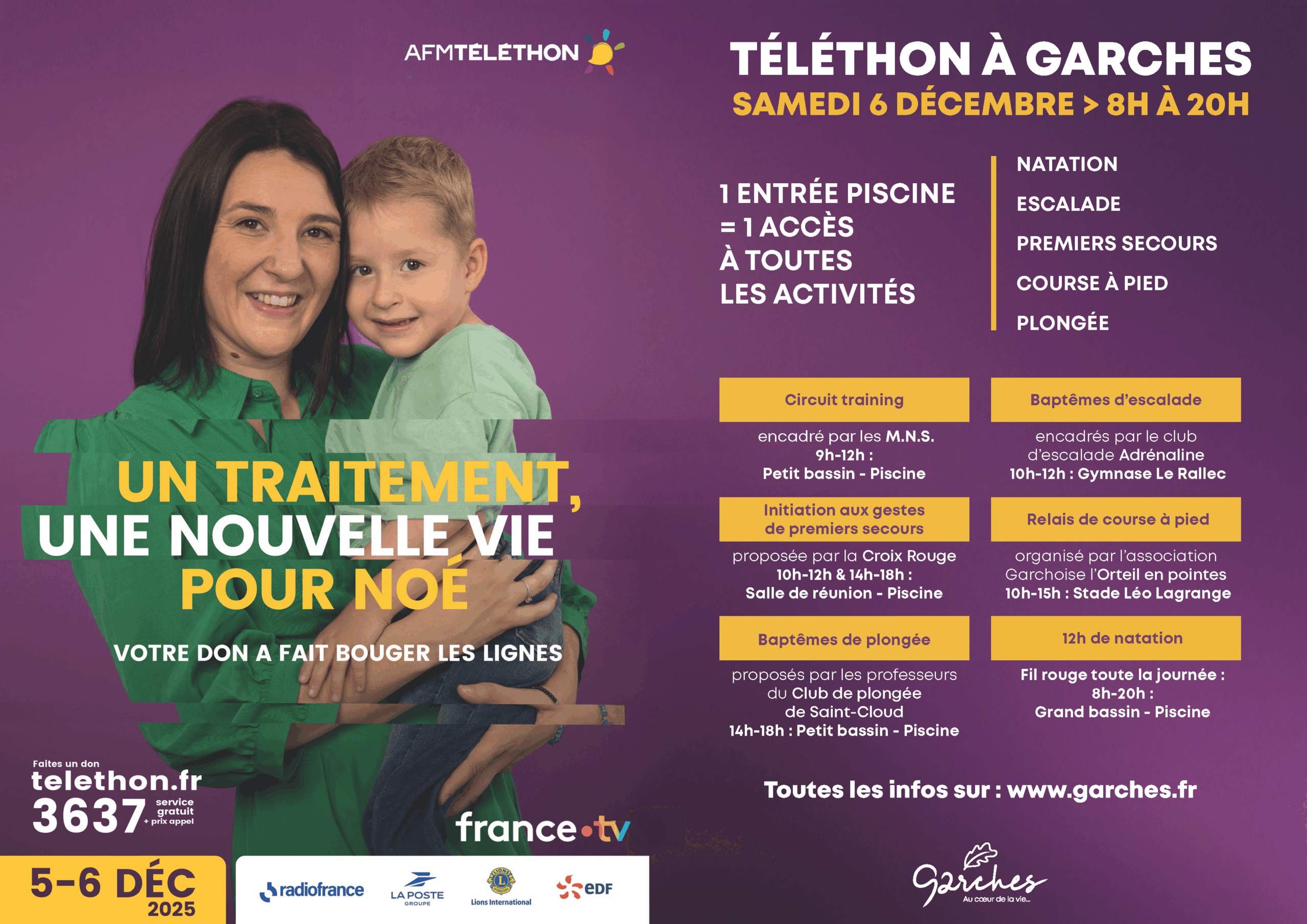 La Ville de Garches se mobilise pour le Téléthon 2025 et vous donne rendez-vous le samedi 6 décembre, de 8h à 20h, pour une journée placée sous le signe du sport, du partage et de la solidarité.