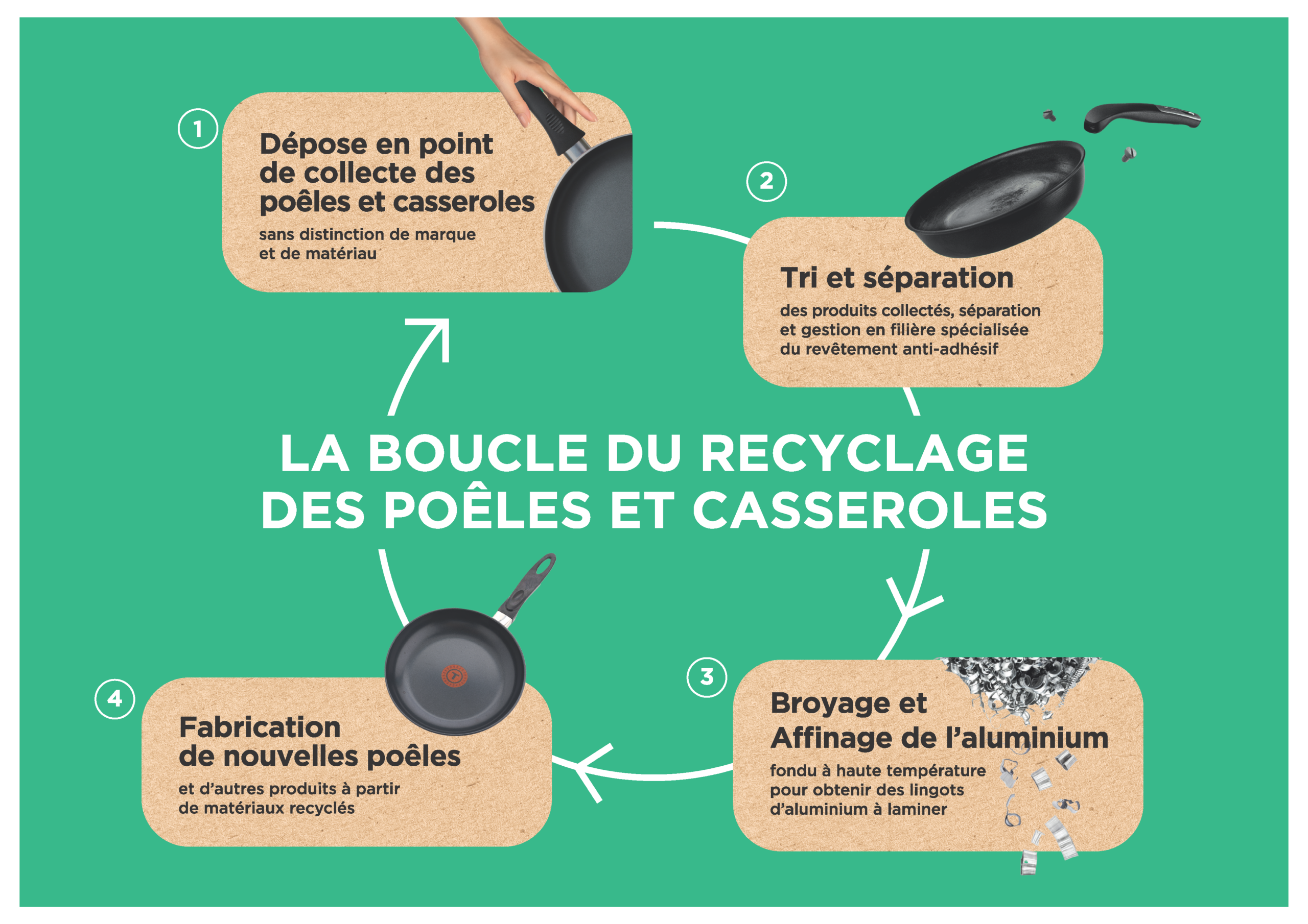 Le recyclage des poêles permet la fabrication d’aluminium recyclé, qui permet lui-même d’économiser plus de 90% d’énergie par rapport à la production d’aluminium vierge. La production d’aluminium vierge, c’est-à-dire non recyclé, nécessite beaucoup d’énergie pour l’extraction de la bauxite et l’électrolyse. La collecte et le recyclage des poêles et des casseroles permet d’obtenir de l’aluminium que l’on peut refondre en consommant moins d’énergie et donc en générant moins d’émissions carbone, cela correspond à une économie de 35 000 tonnes équivalent CO2.