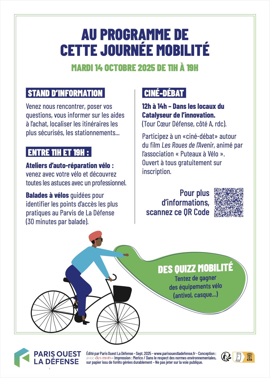 À l’occasion de la Journée nationale de la qualité de l’air, Paris Ouest La Défense organise une grande opération de sensibilisation autour des mobilités douces, mardi 14 octobre, de 11h à 19h, sur le parvis de La Défense.