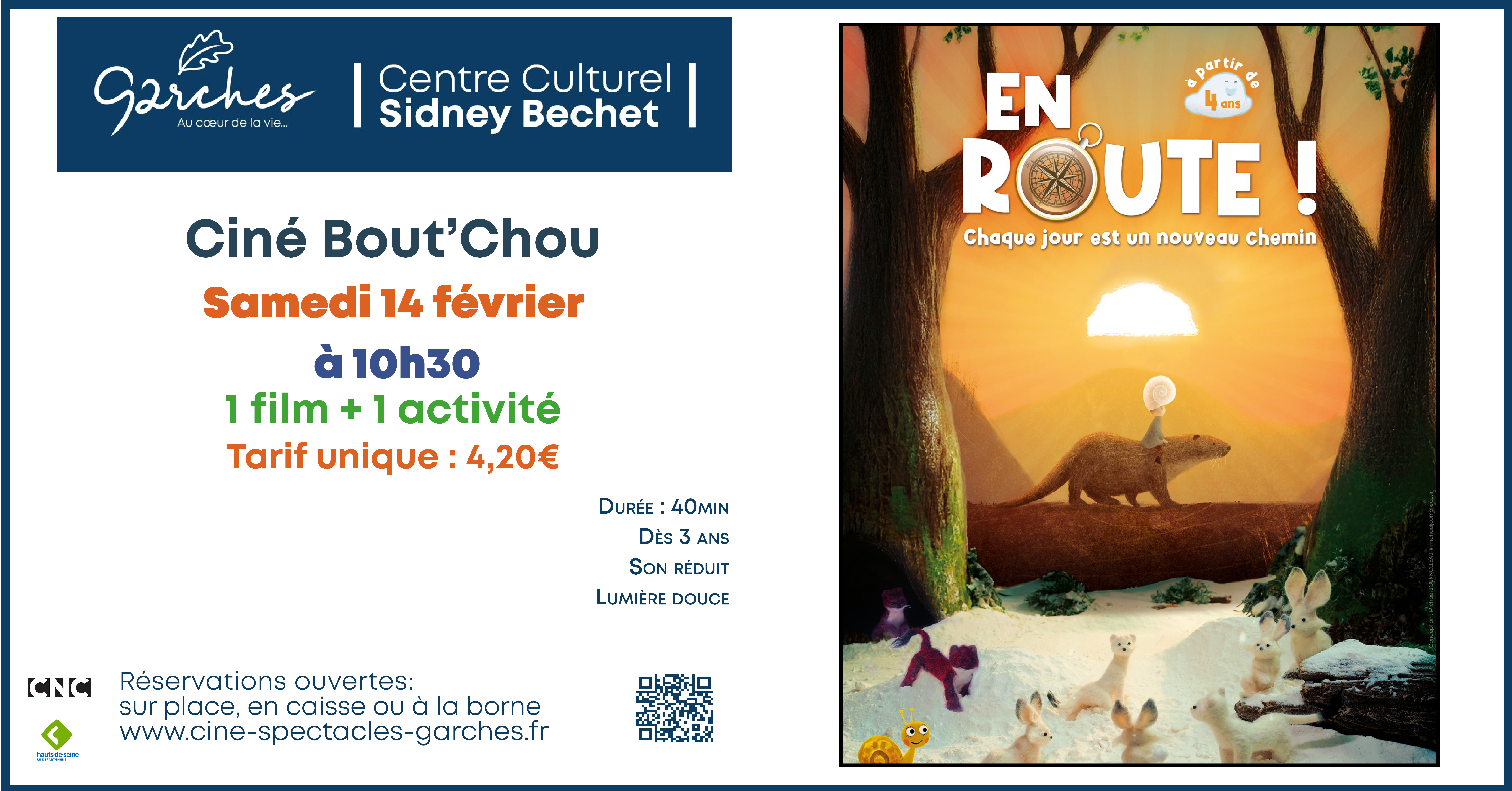 La Ville vous donne rendez-vous samedi 14 février à 10h30 pour le Ciné-Boutchou avec “En route”. Un film de 40min à venir partager en famille et adapté aux plus petits Garchois.