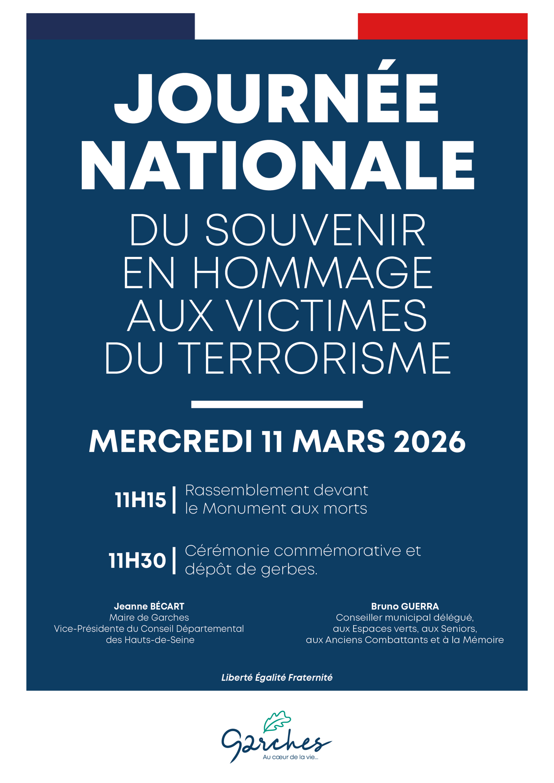 La Ville donne rendez-vous aux Garchois, le mardi 11 mars 2026, pour la cérémonie commémorative à l’occasion de la Journée nationale du souvenir en hommage aux victimes du terrorisme.